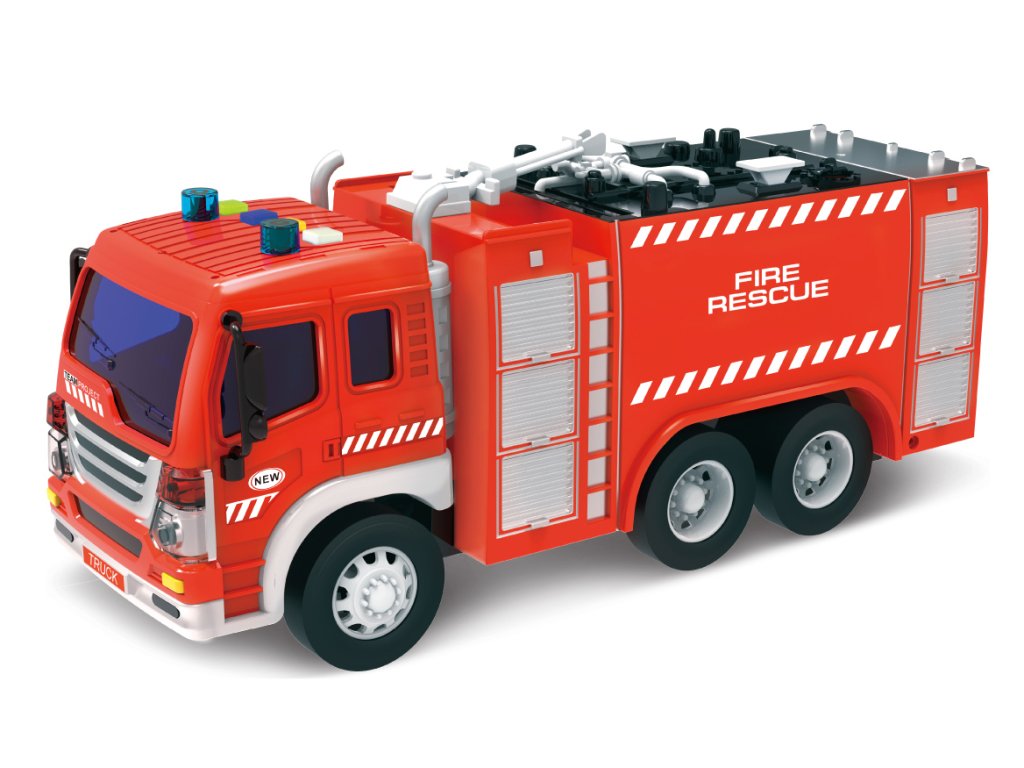 Auto hasičské se stříkačkou a efekty. Velikost 28 cm. Na setrvačník. Světelné a zvukové efekty - tlačítka na kabině. 3xAG13 baterie součástí.Doplňkové parametry