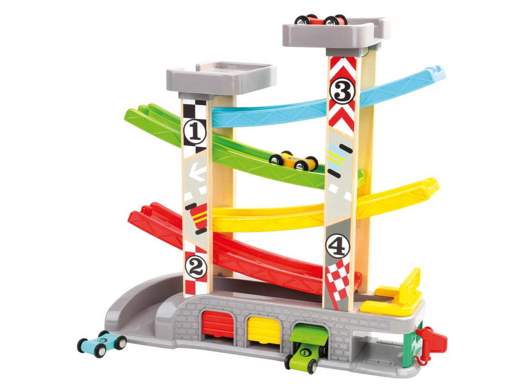 Autodráha s garážemi obsahuje čtyři barevná dřevěná autíčka, která se mohou přetáčet a tak snadno zdolávají kaskádu barevných silniček. Postavte autíčko na nejvyšší část autodráhy a sledujte, co udělá! Zábavná hračka, kterou si zamilují nejen kluci. Rozměr 9x33x34 cm.Doplňkové parametry
