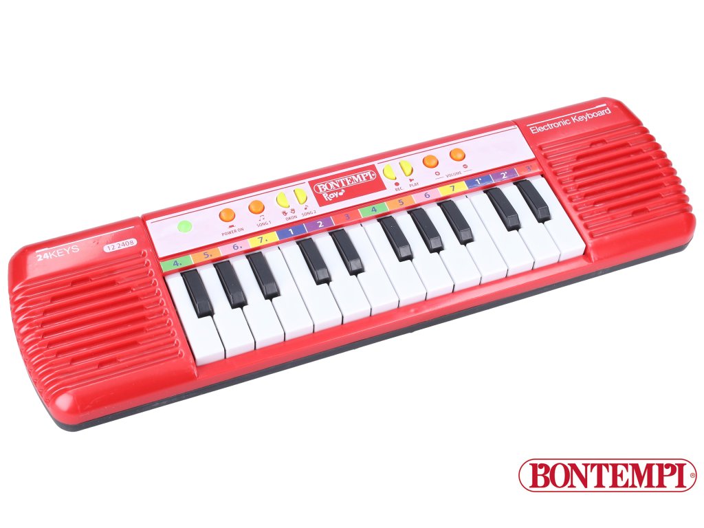 Bontempi Klávesy mini. 24 kláves, 10 melodií, 7 melodií s doprovodem, funkce učení, funkce nahrávání a zpětného přehrání, kontrola hlasitosti, automatické vypnutí. Baterie 2xAA/R6, 1,5V, nejsou součástí.Doplňkové parametry