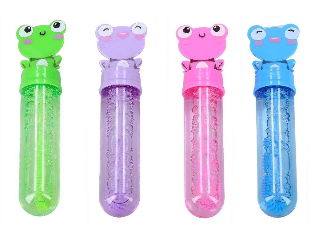 Bublifuk žába. Velikost 14 cm. Přesné rozměry lahvičky 2,5x2,5x14 cm. Display box - 24 ks. 4 varianty - zelená, modrá, růžová, fialová.Doplňkové parametry