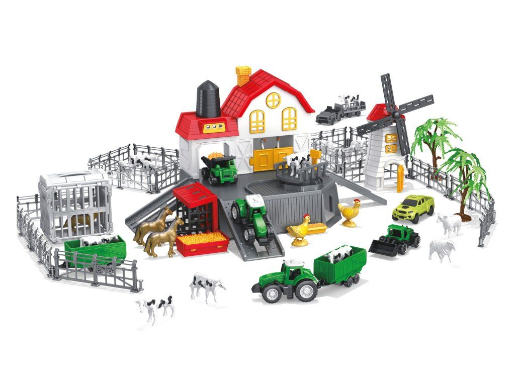 Farma se zvířátky. Součástí vše z obrázků na obalu - farma, mlýn, traktor s vlečkou, sklápěč, nakladač, přepravní vozidlo, ohrada, stromy, figurky zvířátek (koně, slepice, ovce, kozy, pes). Obrázkový návod na složení na zadní straně obalu.Doplňkové parametry