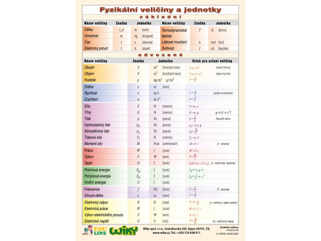 Obsah didaktické pomůcky tvoří přehledná tabulka fyzikálních veličin a jednotek. Fyzikální veličiny jsou rozděleny na základní a odvozené a jsou charakterizovány značkou, jednotkou a vztahem pro jejich určení. Zadní strana je určena k procvičování a přezkoušení učiva.Doplňkové parametry