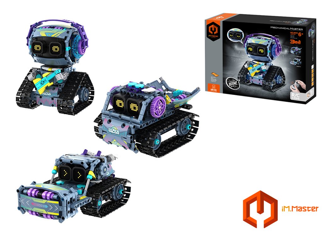 iM.Master Stavebnice robot s kytarou 3v1 RC na dálkové ovládání. Rozměry 14x15,7x21,6 cm. 433 dílků. Ovládání ovladačem nebo smartphonem. Frekvence 2.4GHz. Bluetooth propojení s mobilem. Aplikace pro iOS a Android. Světelné a zvukové efekty. Bateriový pack 300mah 7.4V lithium do robota součástí, 2xAA do ovladače nejsou součástí. USB kabel součástí. Přepínač ON/OFF na ovladači a bateriovém boxu robota.Doplňkové parametry
