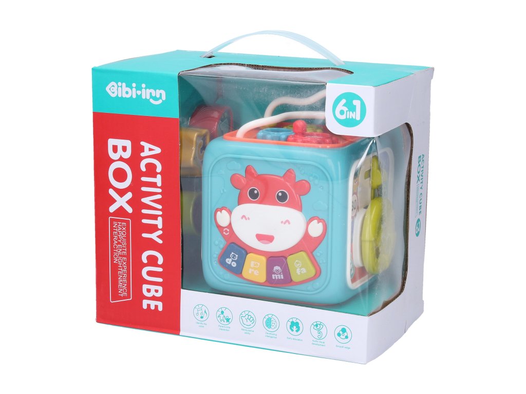 Interaktivní kostka. Rozměry 13x12,5x15,5 cm. 3xAA baterie nejsou součástí. 4 vkládací kostky. Součástí vkládačka, piano, hodiny, ozubená kolečka, volant, dvířka. Piano - 4 módy. 1. mód - piano, 2. mód - 4 písničky, 3. mód - světelná hra, 4. mód - zvuky zvířat, 5. mód - 20 melodií.Doplňkové parametry