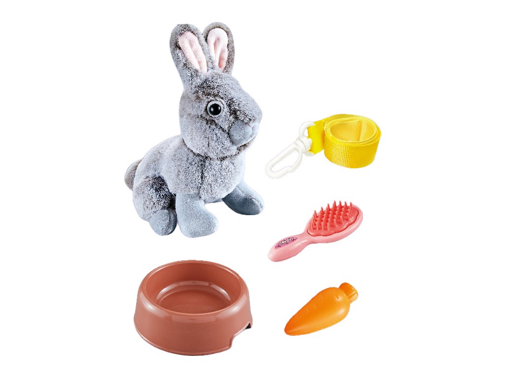 Králík v přepravce. Velikost 28 cm. Součástí je přepravka, plyšový králík a příslušenství: miska, vodítko, hřeben, mrkev. Při zatřesení vydává akustické zvukové efekty.Doplňkové parametry