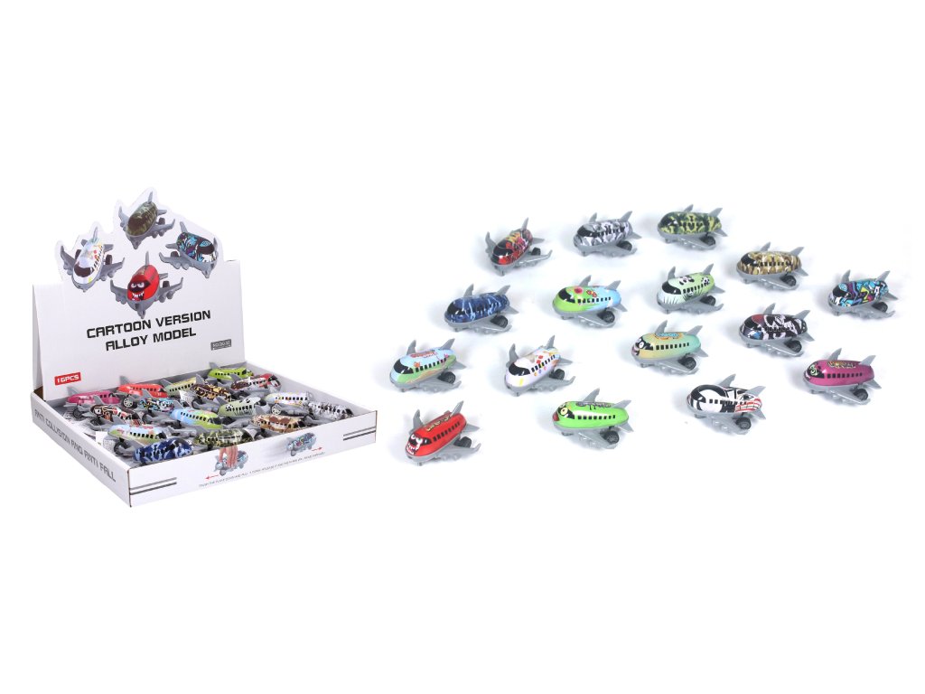 Letadlo kov/plast. Velikost 7,5 cm. Na zpětné natažení. 16 ks display box. 16 barevných variant.Doplňkové parametry