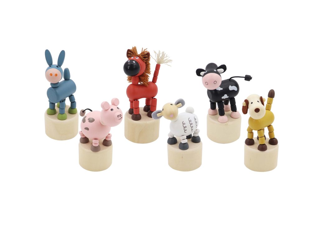 Mačkací zvířátko farma dřevěné. Rozměry 4,5x(4,7-8,5)x(8,8-11,6) cm. 12 ks display box. 6 variant - osel, kůň, kráva, prase, ovce, pes.Doplňkové parametry