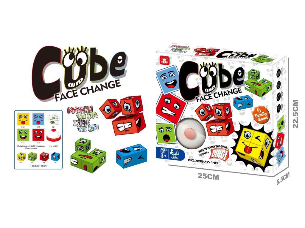 Magické kostky obličeje set. Součástí 4 magické kostky (žlutá, zelená, červená modrá), zvonek, karty s obličeji. Hra pro 2-4 hráče. Co nejrychleji sestavte obličej podle kartičky.Doplňkové parametry