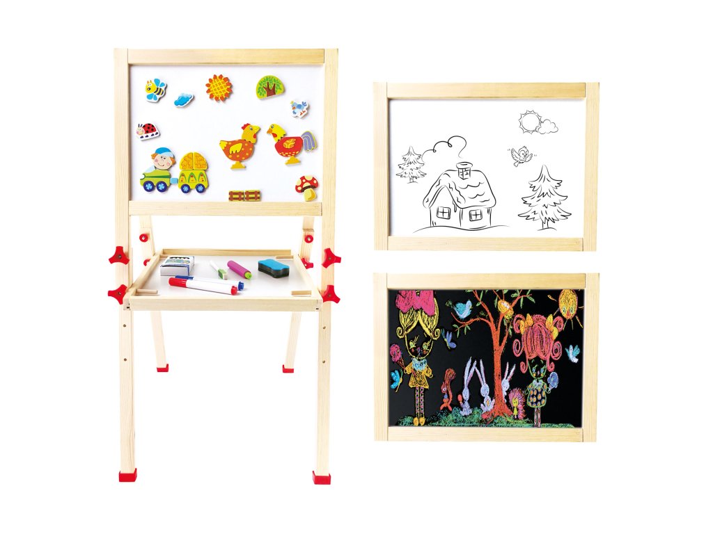 Dětský dřevěný skládací stojan. Obsahuje 61 dílů. Jedna strana stojanu je bílá a magnetická, na kterou se dají magnetem přichytit různé obrázky, které jsou součástí balení, nebo je určena pro psaní fixou.Doplňkové parametry