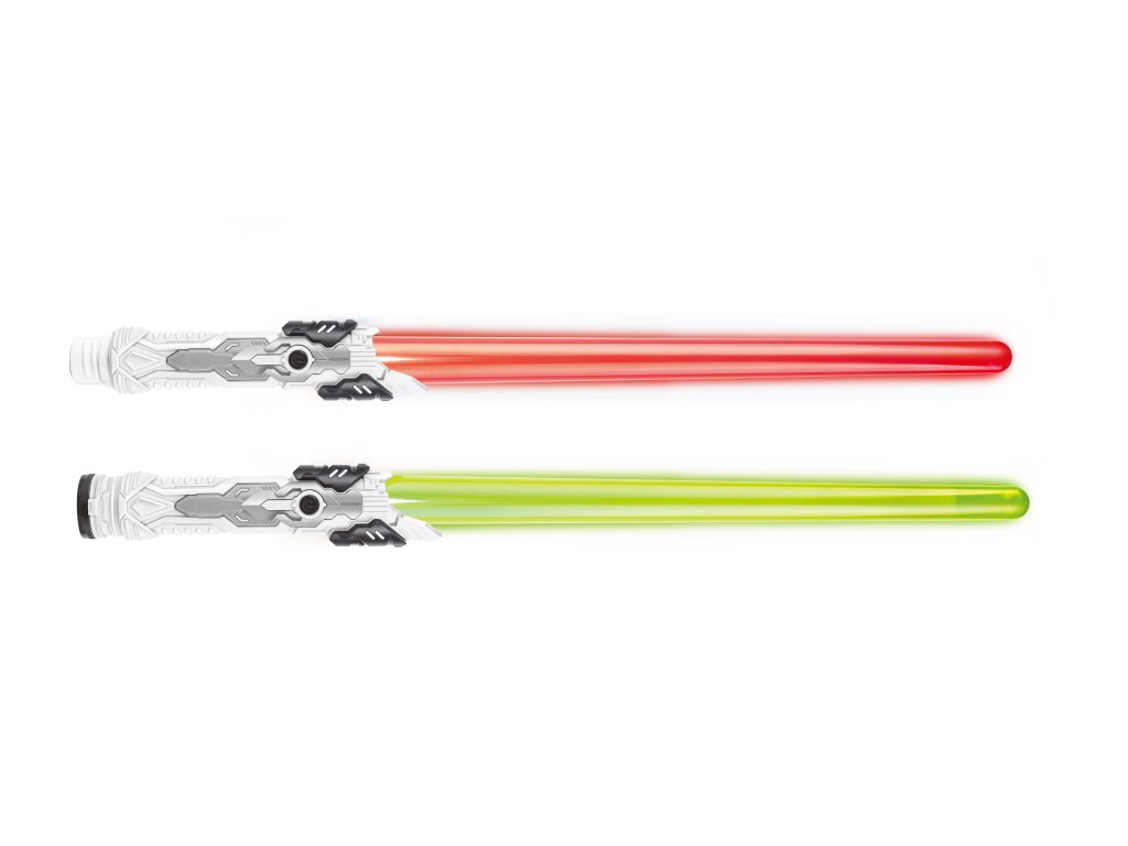Meč světelný dvojitý. Velikost 138 cm. Součástí 2 meče a spojka s držadlem pro pohodlné otáčení dvojitého meče kolem své osy. Světelné a zvukové efekty. 3xAAA baterie (pro každý meč) nejsou součástí. Aktivace efektů tlačítkem na rukojeti.Doplňkové parametry