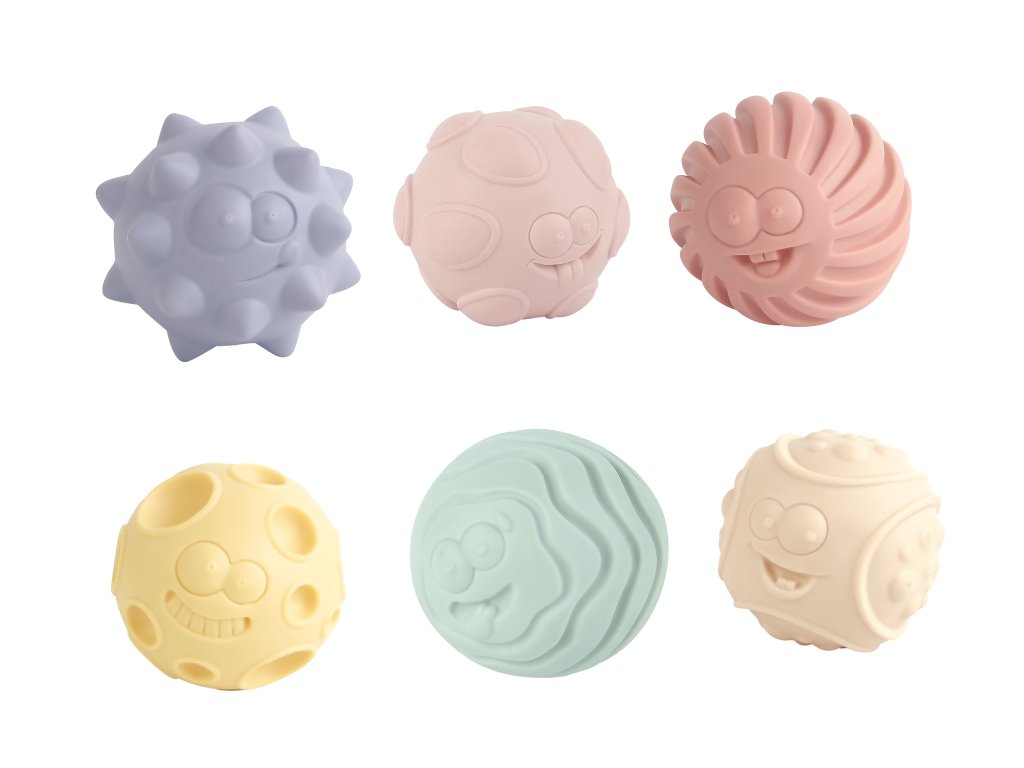 Míčky motorické. Velikost 6 cm. Sada obsahuje 6 ks měkkých míčků s různými povrchy. Při zmáčknutí píská.Doplňkové parametry