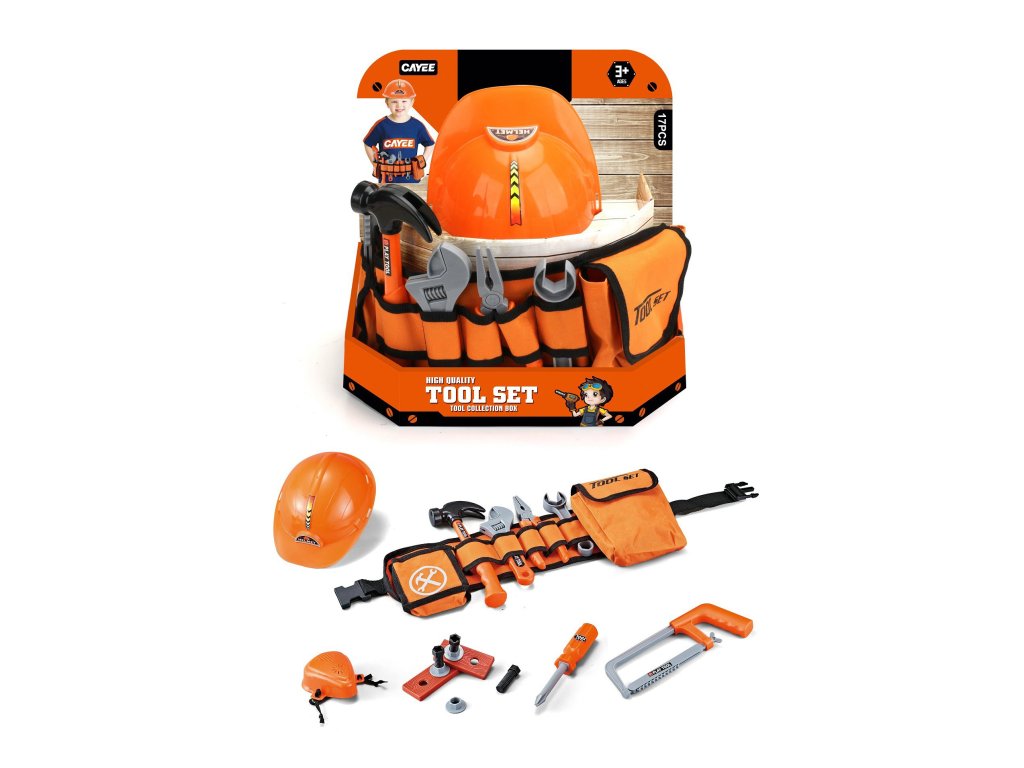 Nářadí s textilním opaskem. Obsahuje textilní opasek, přilbu, roušku, pilku, kladívko, kombinačky, hasák, šroubovák, klíč, 2 dřívka, 3 šrouby, 3 matice.Doplňkové parametry