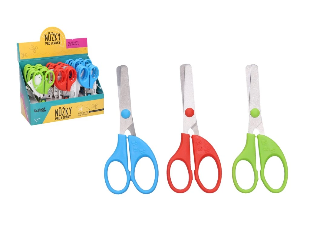 Nůžky barevné pro leváky 13 cm. 3 barevné varianty: červené, modré a zelené. 24 ks v display boxu.Doplňkové parametry