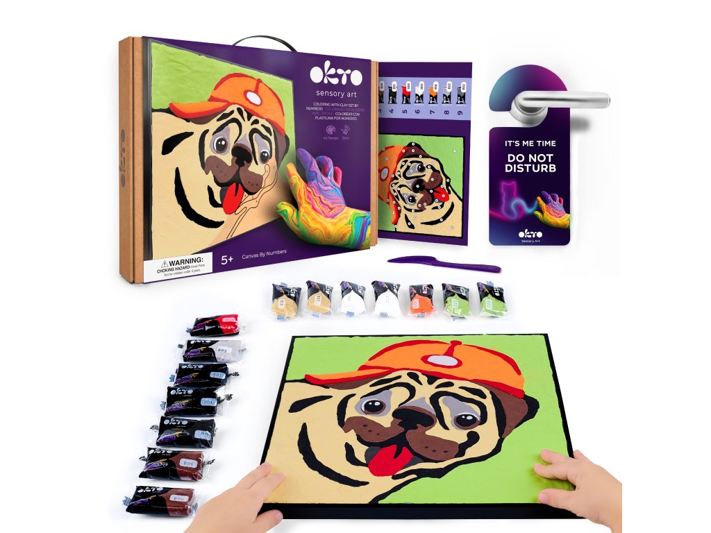 OKTO Malování hmotou podle čísel "Buldoček" 29x29 cm. Obsah balení - rám, plátno, obrázkový návod, modelovací nástroj, sada barevných tvarovacích směsí 14 ks.Doplňkové parametry
