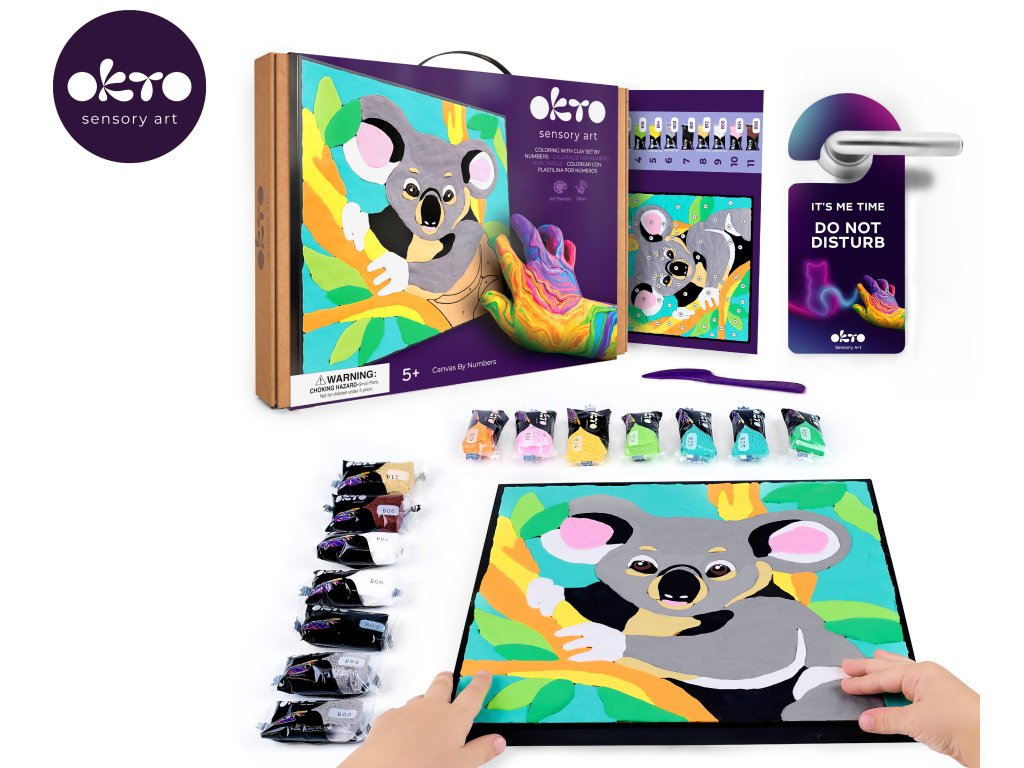OKTO Malování hmotou podle čísel "Koala". Velikost plátna 29x29 cm. Vytvarujte obrázek podle čísel. Obsah balení - plátno, obrázkový návod, modelovací nástroj, sada barevných tvarovacích směsí 14 ks.Doplňkové parametry