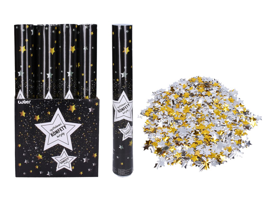 Wiky, Párty konfety vystřelovací Hvězdy 40 cm. Balení: 12 ks v display boxu. Dodržujte prosím všech instrukcí na etiketě. Nenechávejte děti bez dozoru, nemiřte do obličej, na tělo ani zvířata. Rozměry: 38 x 5 cm 16g stříbrných a zlatých hvězdičekDoplňkové parametry