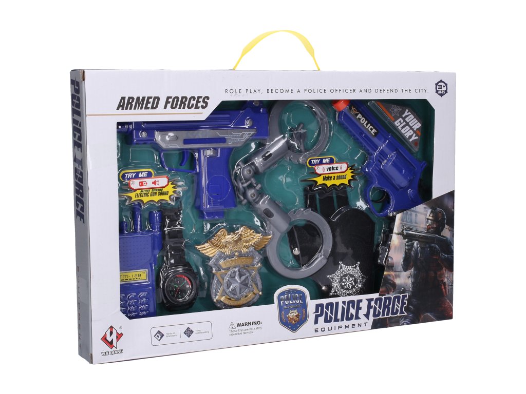 Policejní sada zbraní 18 cm. Obsah balení - samopal 18cm (zvukové efekty), pistole s pouzdrem 18 cm (akustické zvukové efekty), pouta s klíčem, vysílačka, hodinky, odznak. 3xAG13 v samopalu jsou součástí balení.Doplňkové parametry