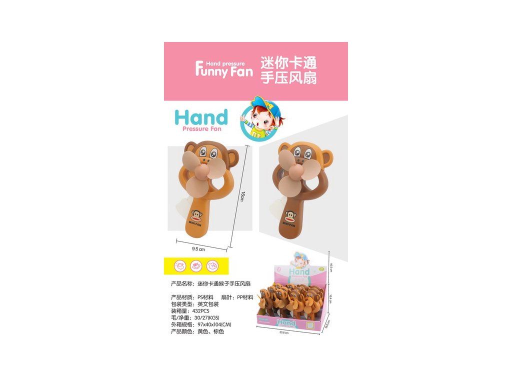 Ruční větráček opice. Rozměry 16x9,5x4,5 cm. 12 ks display box. 2 varianty - světle hnědá, tmavě hnědá.Doplňkové parametry