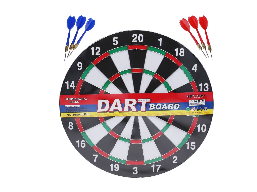 Šipky set 6 šipek. Průměr terče 37 cm. Obsah balení - terč, 3x červená šipka, 3x modrá šipka.Doplňkové parametry