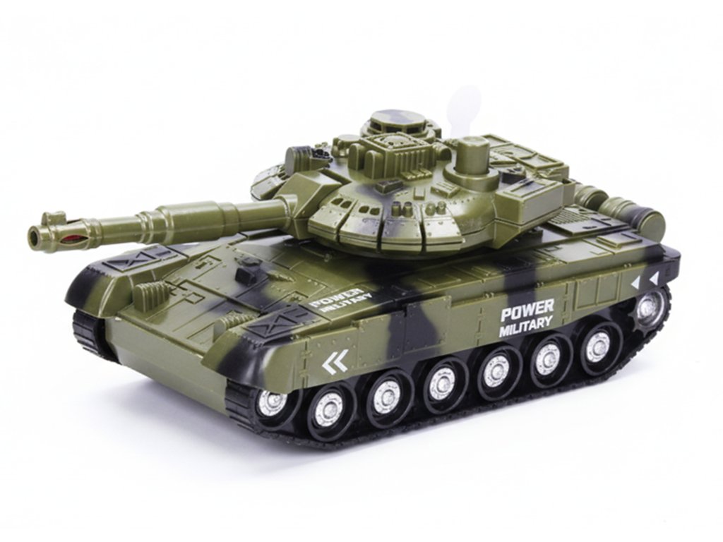 Tank s efekty. Velikost 19,5 x 8 x 7,5 cm. Světelné a zvukové efekty (zvuk střelby a motoru, blikající kanón). Aktivace stiskem tlačítka na střeše. Na setrvačník. 3xAG13 baterie součástí. měřítko 1:20Doplňkové parametry