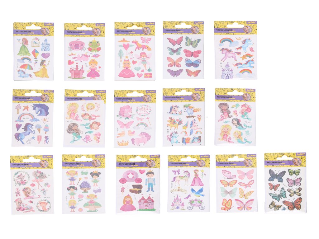Tetovací obtisky 7,5x11 cm. Velký mix (víly, mořské panny, jednorožci, motýli).Doplňkové parametry