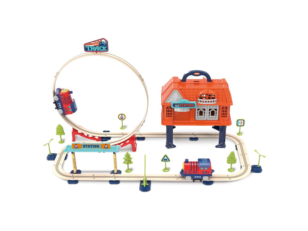 Vlaková dráha v kufříku 69 dílků. Rozměry 67x36,5x36,5 cm. 2xAAA baterie do mašinky nejsou součástí. Komínek mašinky slouží jako tlačítko ON/OFF. Obsah - dráha, mašinka, 1 budova, zastávka, závora, značky, stromy, světla. Obrázkový návod na sestavení na vnitřní straně obalové karty.Doplňkové parametry