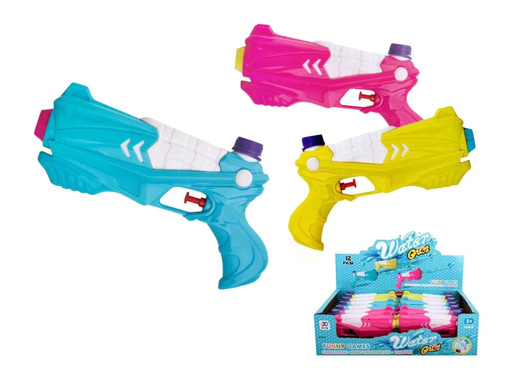 Vodní pistole. Rozměry 22x4x13 cm. 12 ks display box. 3 varianty - modrá, žlutá, růžová.Doplňkové parametry