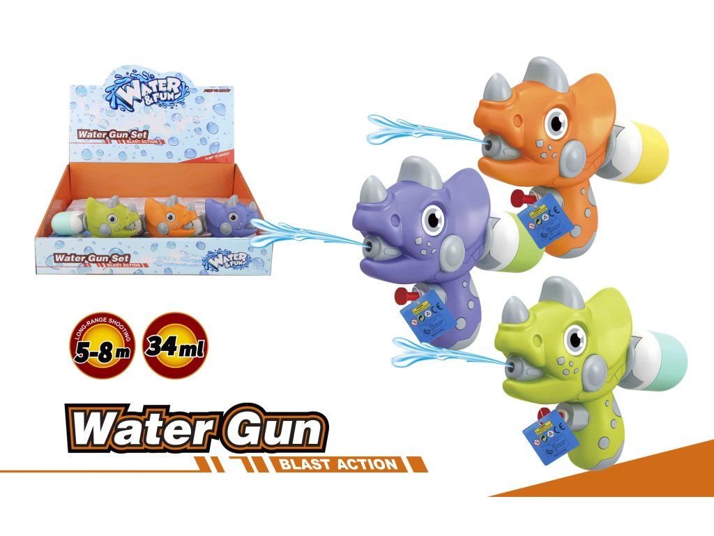 Vodní pistole dinosaurus. Rozměry 15x4x12 cm. 12 ks display box. 3 varianty - zelená, oranžová, fialová.Doplňkové parametry