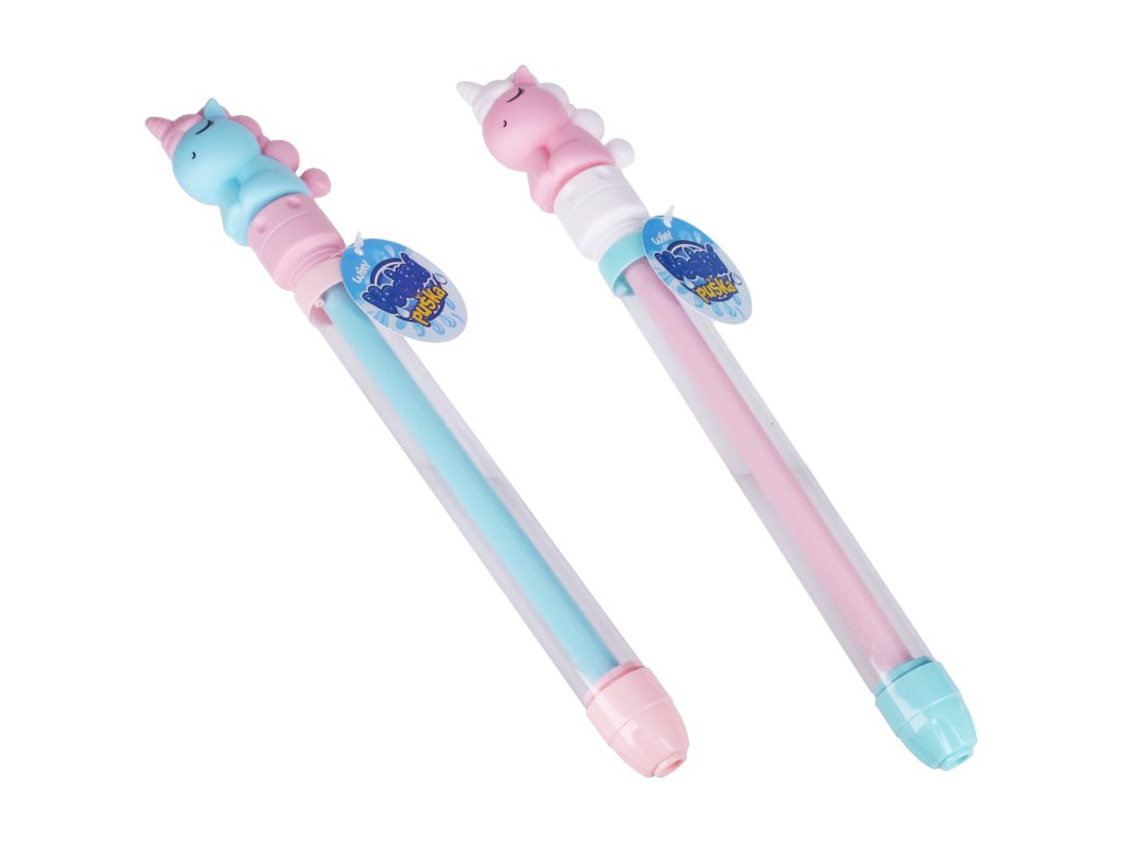 Vodní puška jednorožec - Český obal. Velikost 37 cm. 12 ks display box. 3 varianty - modrá, růžová, bílá.Doplňkové parametry